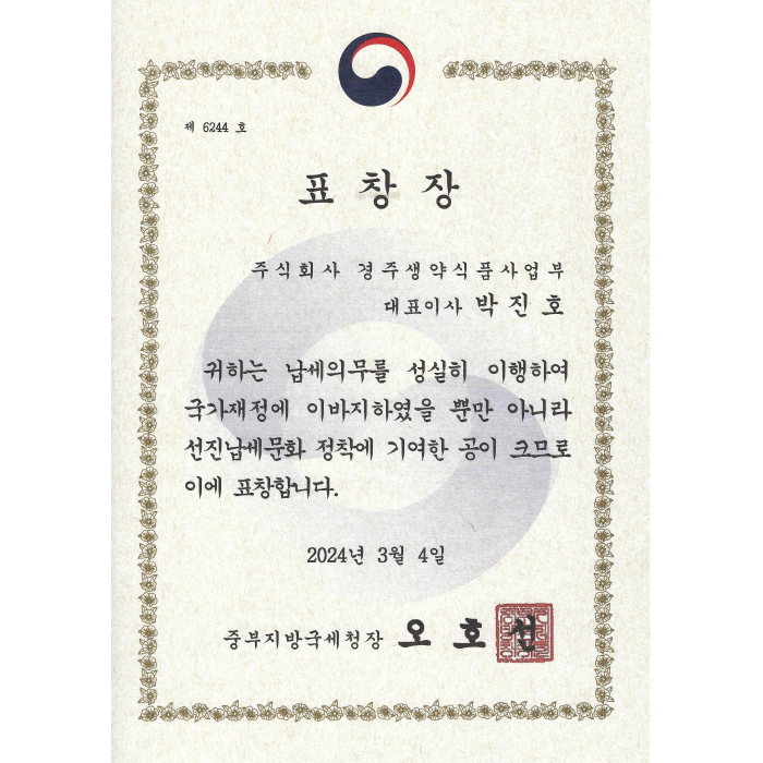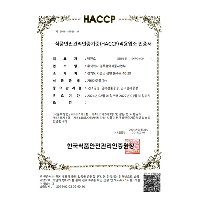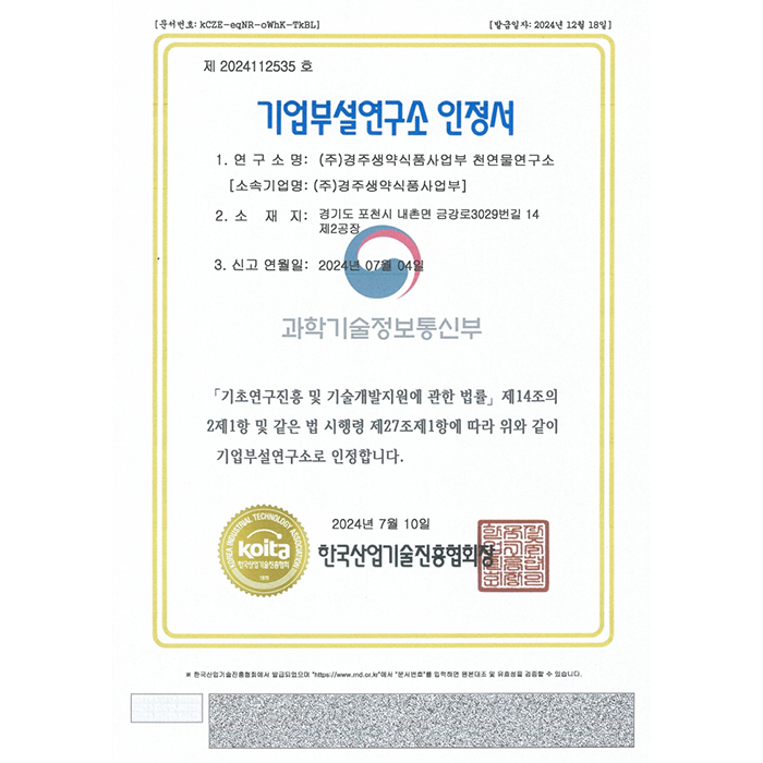 (주)경주생약은 철저한 품질관리 시스템과 끊임없는 연구개발을 통해 그 우수성을 인정받고 있습니다.